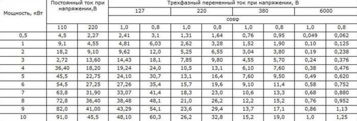 Поможет избежать вычисления заранее составленная таблица перевода, где приведены значения для активной нагрузки и наиболее распространенного значения cosø=0.8.