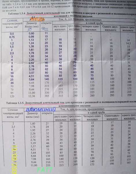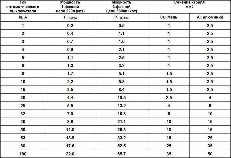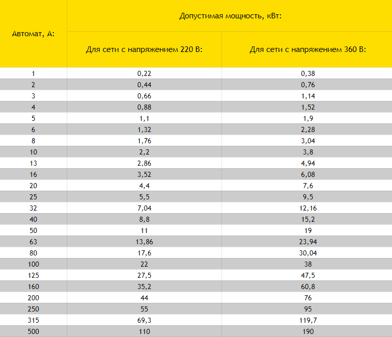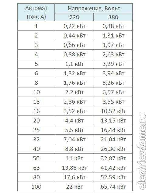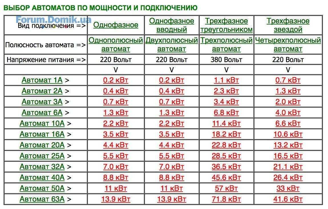 Таблица, как преобразовать Амперы в Ватты для расчета автоматических выключателей: