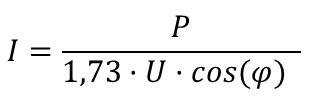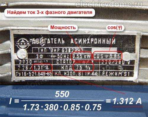 Значение тока, потребляемого от сети трехфазным электродвигателем, следует брать из его паспортных данных (указываются на двигателе или в его паспорте). В случае если в паспортных данных отсутствует значение тока, то он может быть вычислен по формуле: