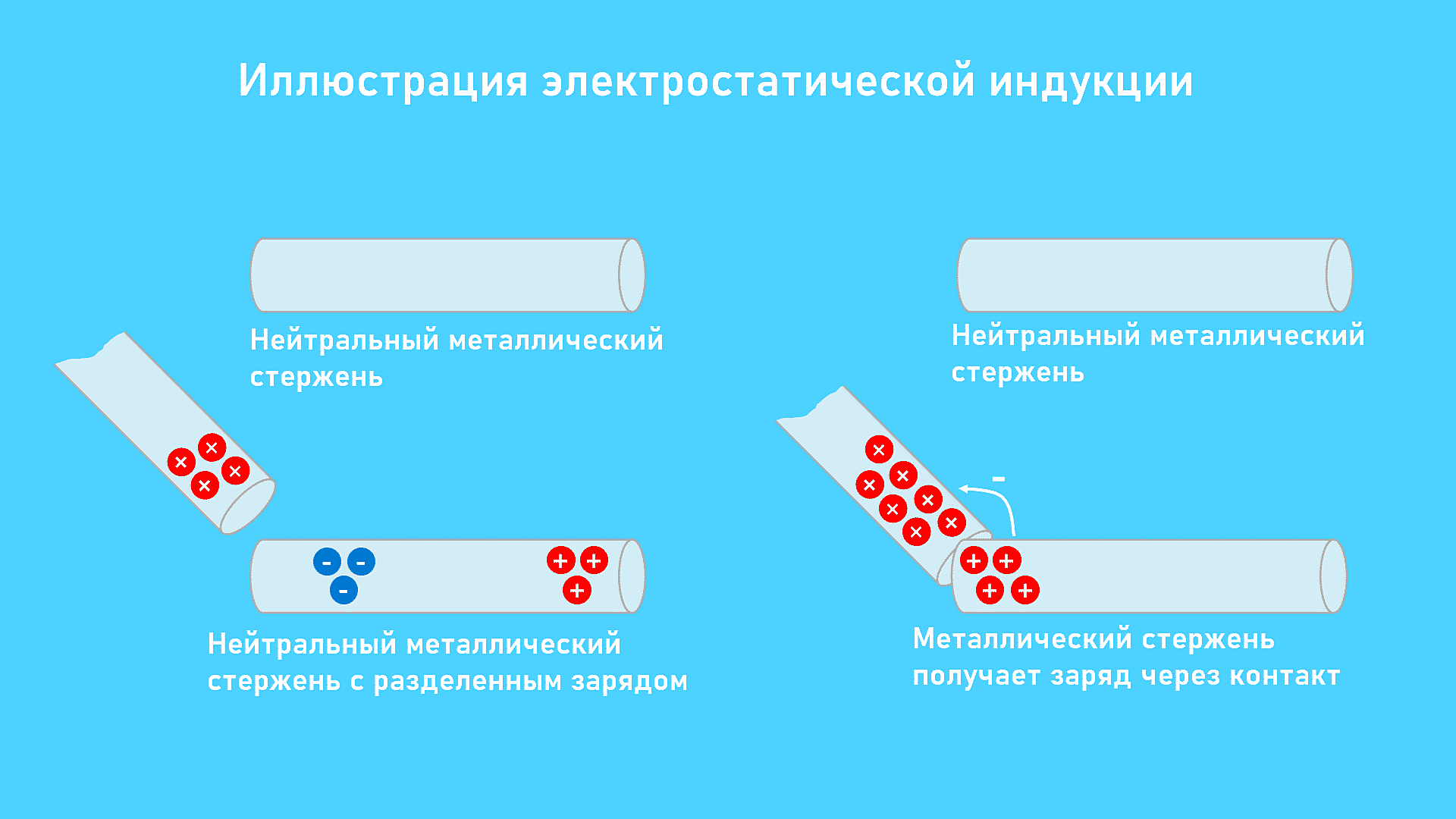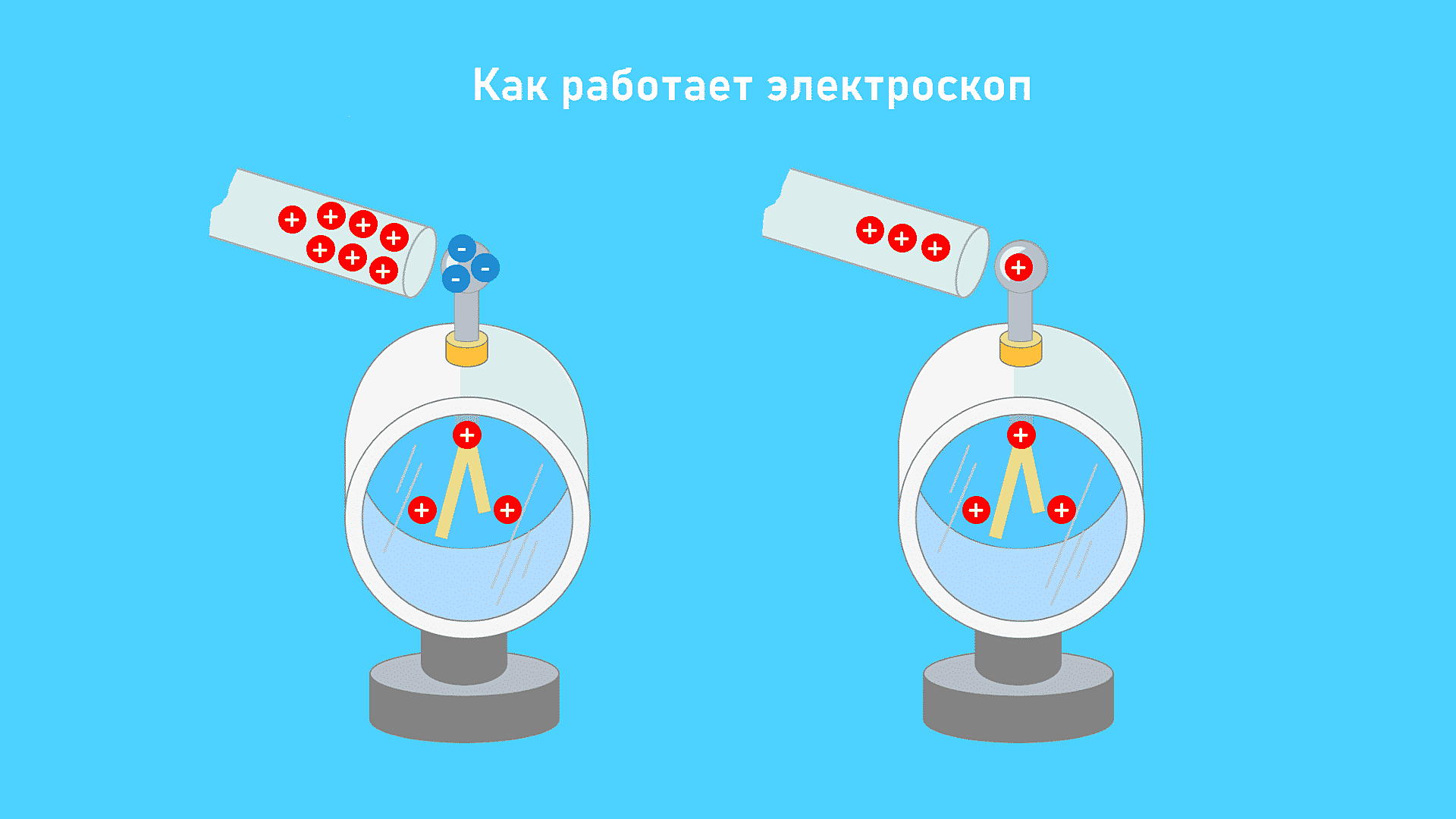 Теперь вы знаете конструкцию электроскопа. Но как именно работает электроскоп? Для этого нам понадобятся знания о электростатической индукции и отталкивании одноименных электрических зарядов. Рассмотрим эти явления ниже.