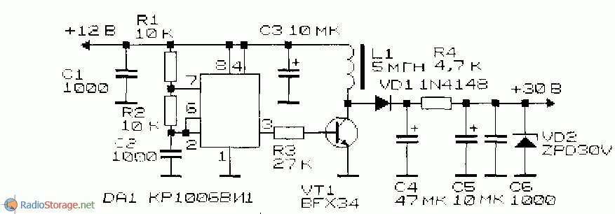 Рис. 12. Схема преобразователя напряжения с выходным стабилизированным напряжением 30 В.