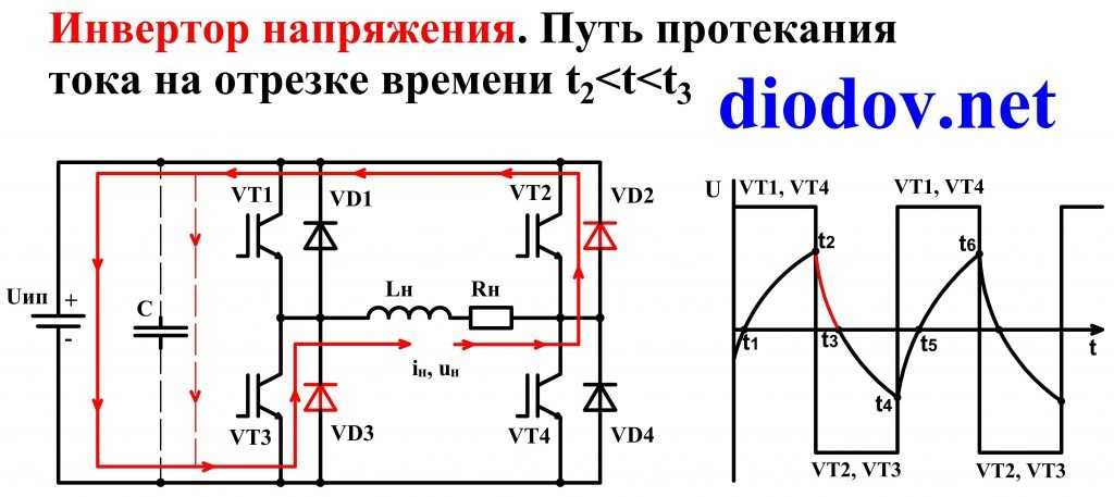 В точке t4, расположенной на оси времени t, снимается управляющий сигнал с VT1,3, а VT1 и VT4 открываются. Однако iн продолжает протекать в ту же сторону, пока не расходуется энергия, запасенная в индуктивности. Это будет происходить на интервале времени t4 – t5.