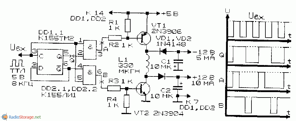 Во время третьей фазы замыкаются оба ключа, в результате чего катушка индуктивности вновь накапливает энергию. При размыкании ключа VT1 во время заключительной фазы импульсов эта энергия передается на отрицательную шину питания. При поступлении на вход импульсов с частотой 8 кГц схема обеспечивает выходные напряжения ±12 В. На временной диаграмме (рис. 11, справа) показано формирование управляющих импульсов.