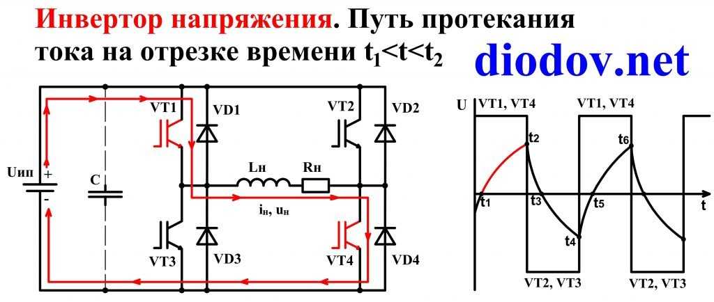 В момент времени t1 открываются VT1 и VT4, а VT2 и VT3 – закрыты. Образуется единственный путь для протекания тока через нагрузку: «+» Uип – VT1 – нагрузка RнLн – VT4 – «-» Uип. Таким образом, на интервале времени t1 ‑ t2 создается замкнутая цепь для протекания iн в соответствующем направлении.
