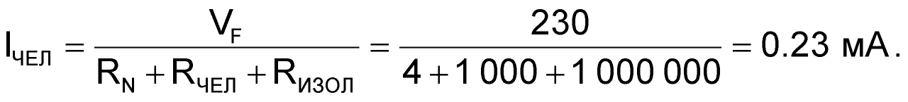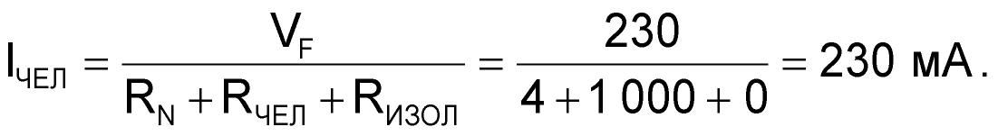 Как видно из формулы (9), ток, протекающий через тело человека, находится ниже порога чувствительности, поэтому мы ничего не чувствуем, когда дотрагиваемся до приборов, работающих от сети, например, беря в руки смартфон, находящийся на зарядке. Но если изоляция трансформатора или дросселя будет повреждена (RИЗОЛ ≈ 0 Ом), при прикосновении к поврежденному прибору через человека пройдет ток величиной: