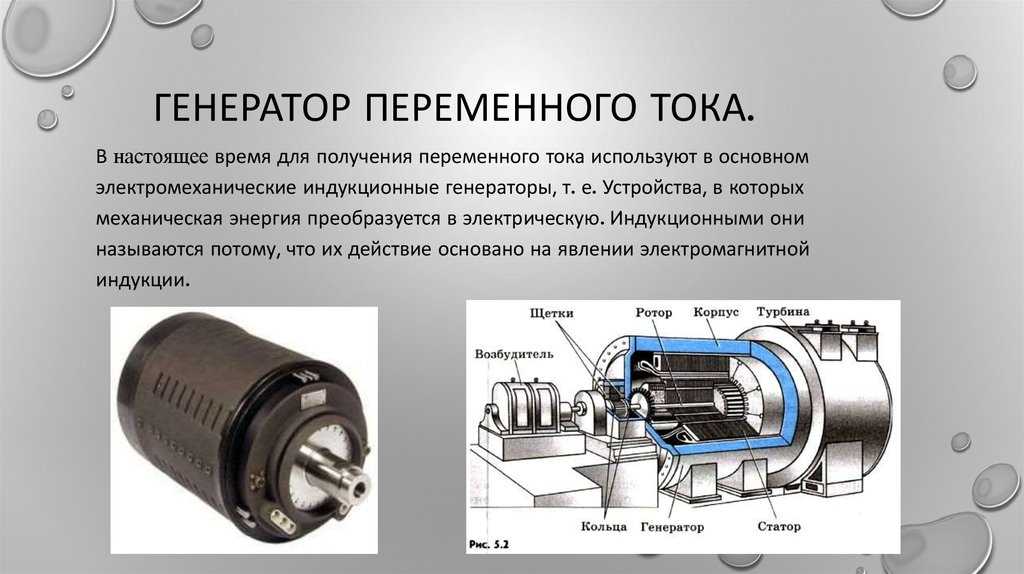 Они состоят из электромагнита или постоянного магнита, создающие магнитное поле, и обмотки, в которой индуцируется переменная ЭДС. Так как ЭДС, наводимые в последовательно соединенных витках, складываются, то амплитуда ЭДС индукции в рамке пропорциональна числу витков в ней. Она пропорциональна также амплитуде переменного магнитного потока через каждый виток. Для получения большого магнитного потока в генераторах применяют специальную магнитную систему, состоящую из двух сердечников, сделанных из электротехнической стали. Обмотки, создающие магнитное поле, размещены в пазах одного из сердечников, а обмотки, в которых индуцируется ЭДС, — в пазах другого. Один из сердечников (обычно внутренний) вместе со своей обмоткой вращается вокруг горизонтальной или вертикальной оси. Поэтому он называется ротором.