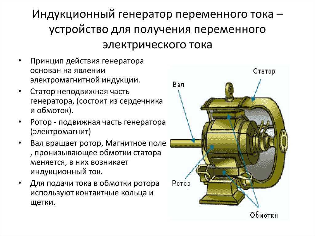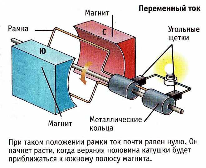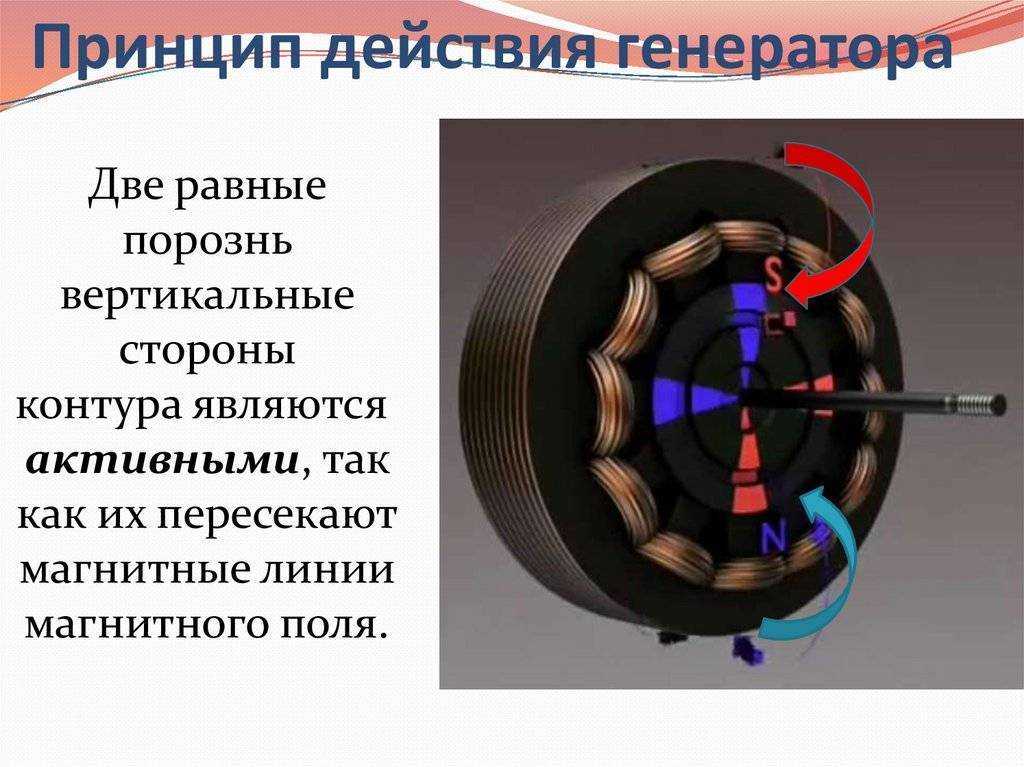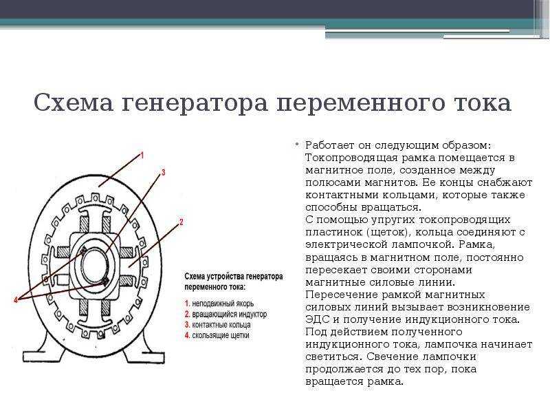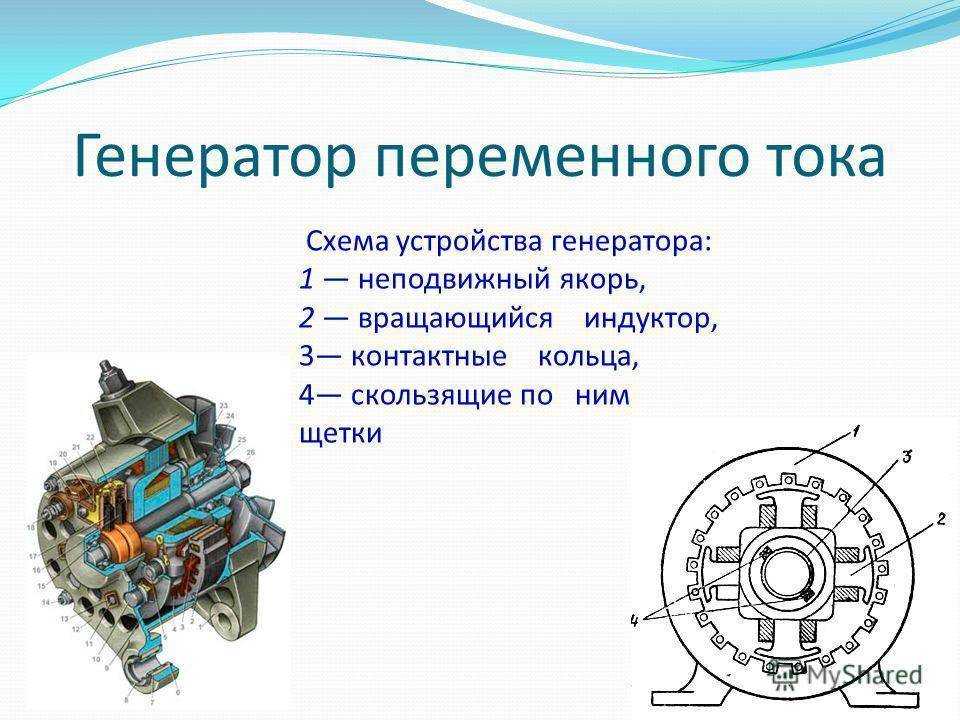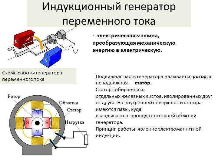 Это электрическая машина, преобразующая механическую энергию в электрическую энергию переменного тока, например, за счет вращения проволочной катушки в магнитном поле, или, наоборот, за счет вращения магнита. До тех пор, пока силовые линии магнитного поля пересекают проводящую катушку, в ней индуцируется электрический ток. Индуцированный электрический ток течет таким образом, что его поле отталкивает магнит, когда рамка приближается к нему, и притягивает, когда рамка удаляется. Каждый раз, когда рамка изменяет ориентацию относительно полюсов магнита, электрический ток также изменяет свое направление на противоположное. Все то время, пока источник механической энергии вращает проводник (или магнитное поле), генератор будет вырабатывать переменный электрический ток.