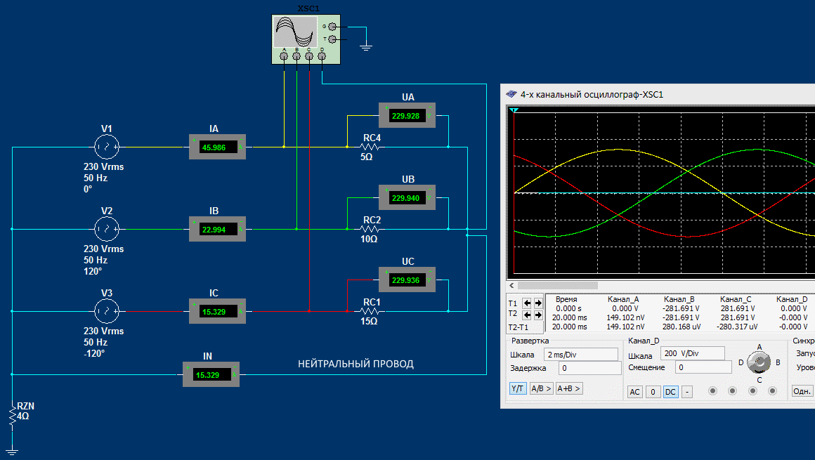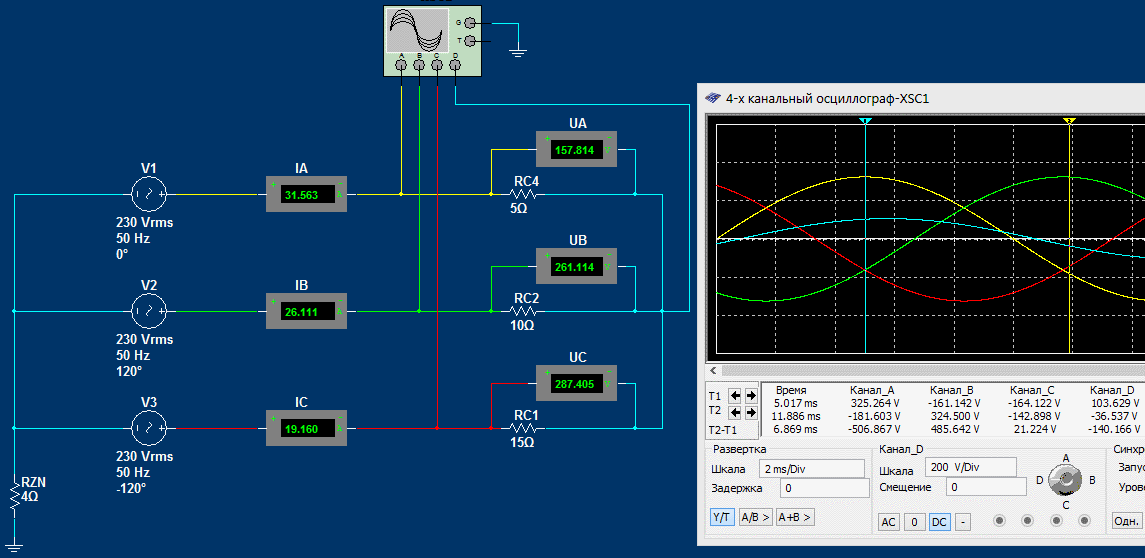Так как в нейтральной точке имеется потенциал, отличный от нуля, то это приводит к несимметрии фазных напряжений. К примеру, если бы потенциал в нейтральной точке был равен 0 Вольт (случай симметричной нагрузки), то фазное напряжение UA можно было бы рассчитать, как +162,5-(-162,5)-0 = 325 Вольт (амплитудное значение). 325/√2 ≈ 230 Вольт (действующее значение). В случае с несимметричным потреблением в нейтральной точке будет всегда какой-то потенциал. Соответственно при расчетах мы получим иное амплитудное и действующее значение напряжения. Из примера просчитанного в программе видно, что действующее напряжение UA ≈ 157 Вольт. Соответственно амплитудное равно 157×√2 ≈ 222 Вольт. Это можно наглядно увидеть на графиках синусоид, приведенных выше. Берем пик синусоиды фазы A с напряжением (потенциалом) +325 Вольт, и от этого потенциала отнимаем потенциал нейтрали (канал D) +103 Вольт в данный момент времени. То же самое можно сделать с остальными фазами. Берем пик синусоиды фазы B с напряжением (потенциалом) +325 Вольт, и от этого потенциала отнимаем потенциал нейтрали (канал D) -36 Вольт в данный момент времени. Получаем +325-(-36) = +361 Вольт (амплитудное значение). 355×√2 ≈ 255 Вольт (действующее значение). Приблизительно это и показывает вольтметр UB ≈ 261 Вольт.