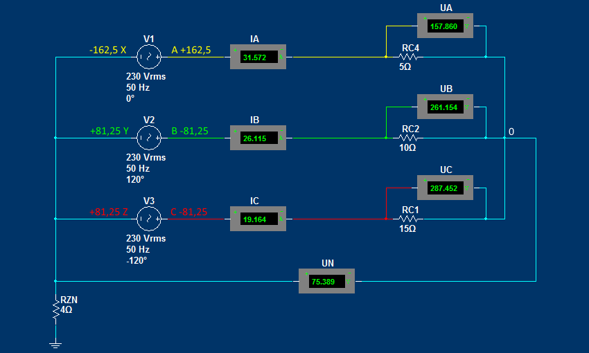 В приведенной выше схеме наблюдается несимметрия потребления. Фаза A нагружена больше и имеет сопротивление 5 Ом. Фаза B нагружена меньше и имеет сопротивление 10 Ом. Фаза C нагружена еще меньше и имеет сопротивление 15 Ом. С учетом этого произошла несимметрии фазных напряжений (UA ≈ 157 Вольт, UB ≈ 261 Вольт, UC ≈ 287 Вольт). Смещение нейтральной точки соединения приемников () привело к появлению разности потенциалов с нейтралью трансформатора UN = 75 Вольт.