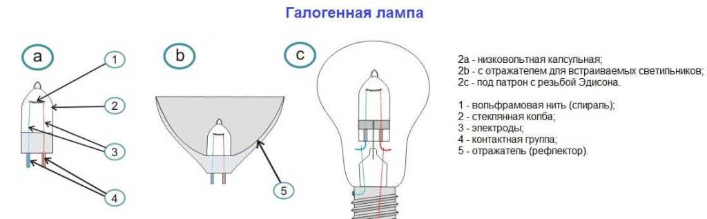 Внешне при условии наличия определенного типа цоколя галогенные источники света можно спутать с лампами накаливания. Главное отличие между этими вариантами заключается в наличии газообразных веществ, которые находятся внутри колбы галогенного исполнения. Конструкция разных моделей таких ламп отличается.
