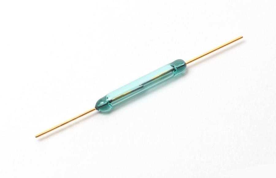Датчик геркон выглядит как небольшая стеклянная трубочка из зеленого полупрозрачного стекла. С двух сторон имеются проволочные выводы. Они позволяют припаять деталь к плате или подсоединить к ней провода. Существуют и трехконтактные модели.