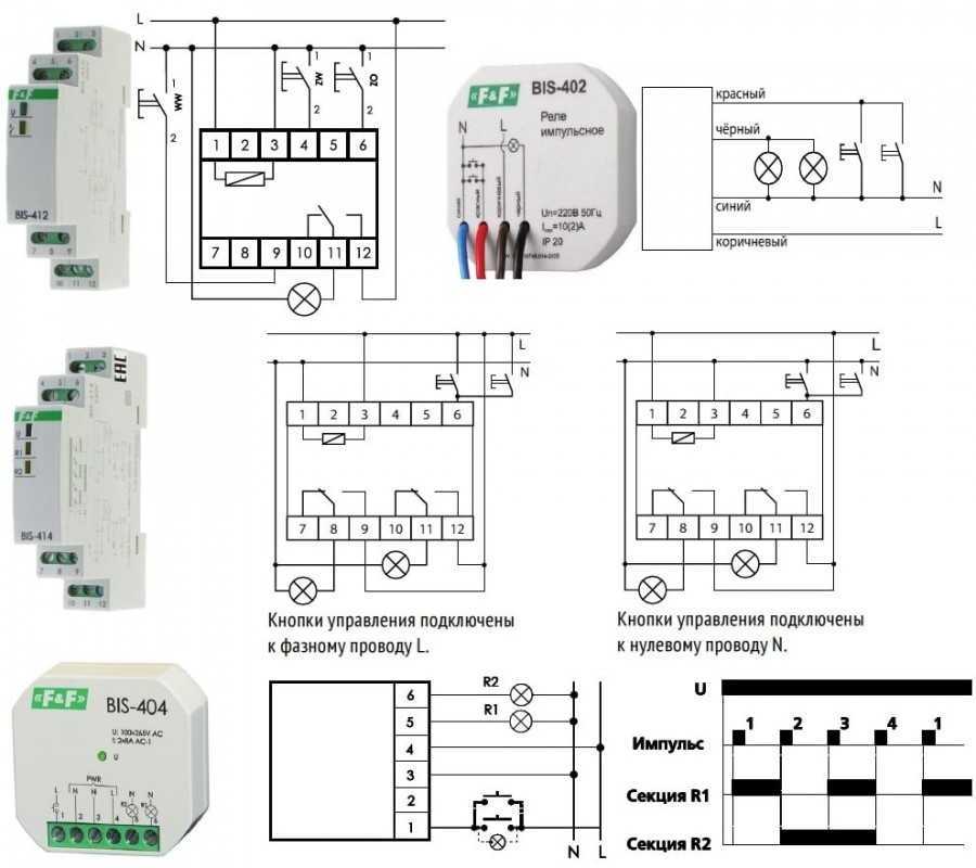 Почти все импульсные реле, могут работать с выключателями с неоновой подсветкой. При большом их количестве (более 10) рекомендуется установить конденсатор ёмкостью 0,15–0,33 мкФ 275 VAC между выводами 1 и 6 (BIS-411, BIS-412, BIS-413, BIS-414).