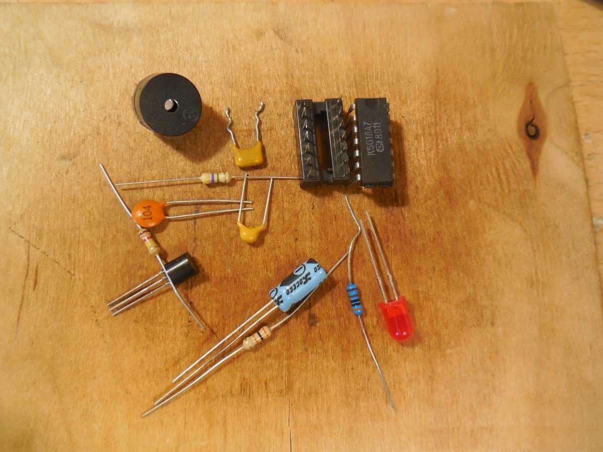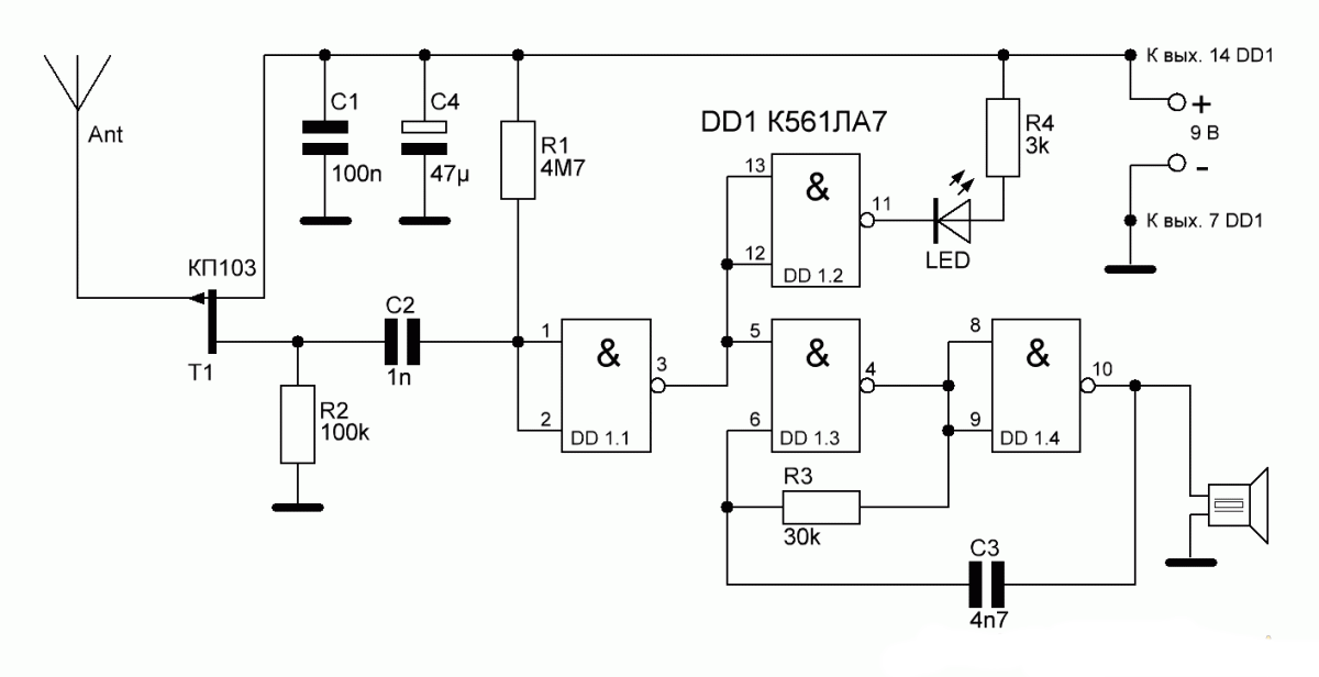 Также в схеме используется микросхема К561ЛА7 , которая представляет собой 4 логических элемента 2И-НЕ. Её можно заменить импортным аналогом, микросхемой CD4011 . Светодиод на схеме загорается тогда, когда антенна оказывается в непосредственной близости от провода под напряжением.