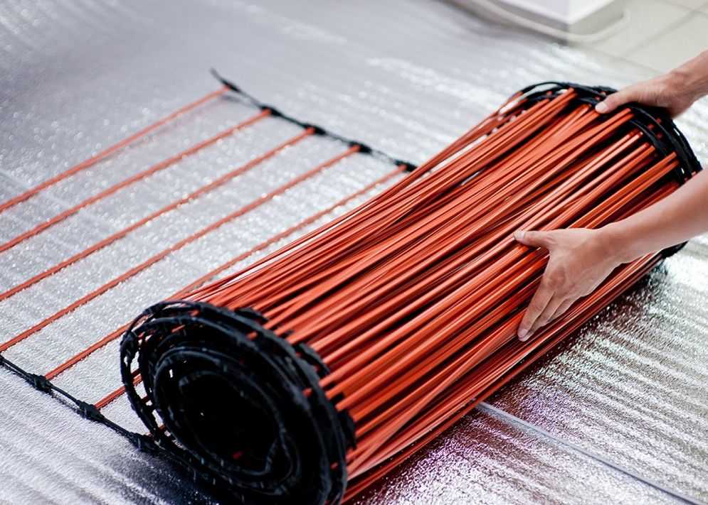Предварительно нарезанные на полосы нужной длины маты расстилают на слой теплоизоляции, от стен на расстоянии 15 см. Они не должны накладываться один на другой, следует делать небольшой отступ между ними.