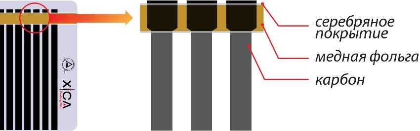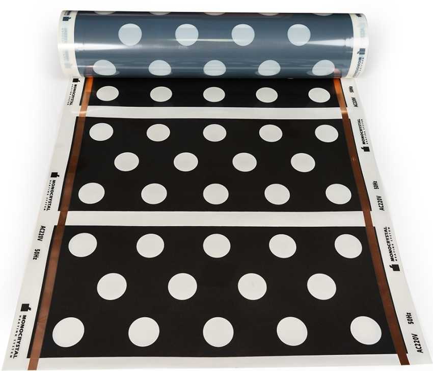 Основа материала представлена лавсановой пленкой. Пленочный инфракрасный пол из углерода монтируется на горизонтальные и вертикальные поверхности.