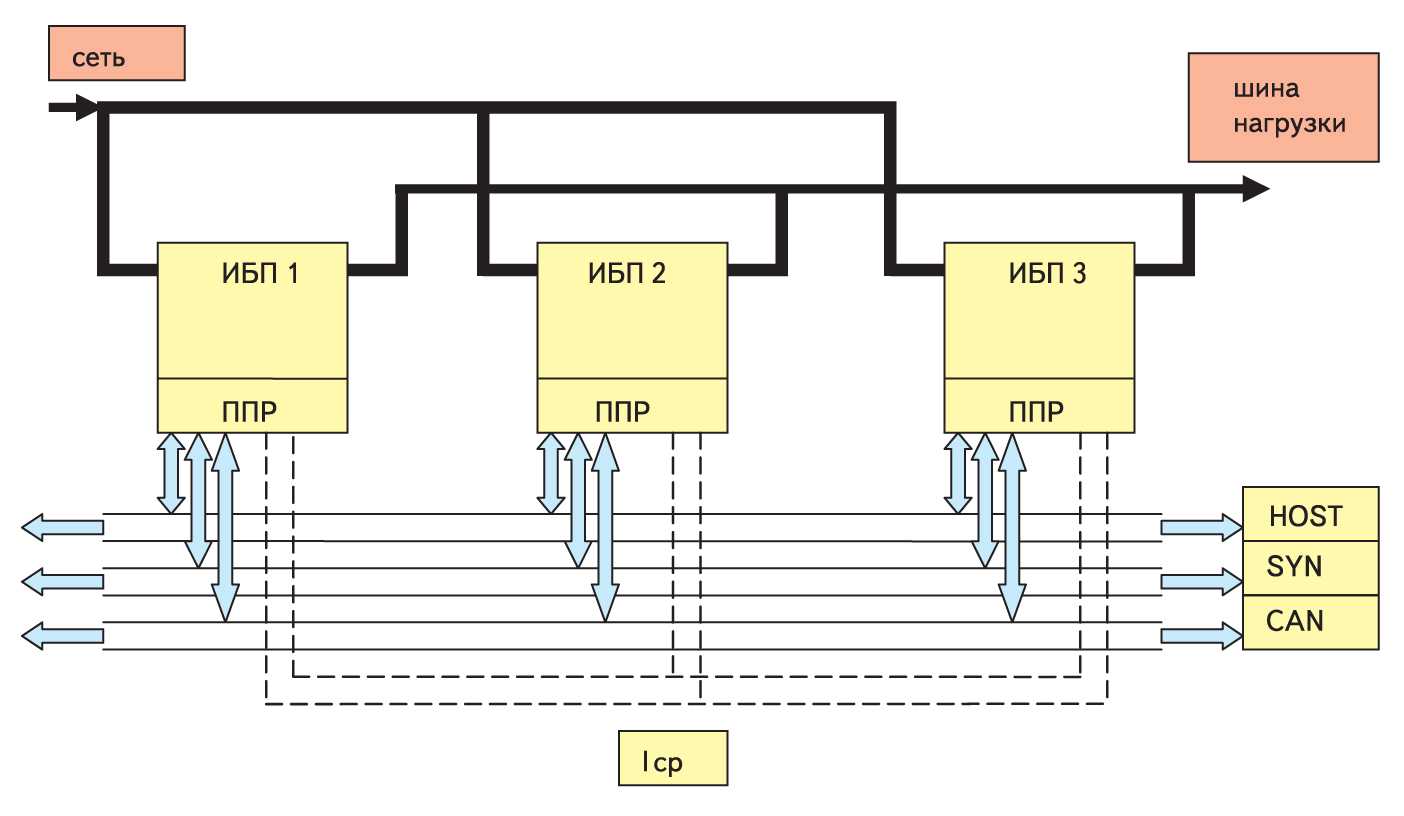 На общей шине возникает напряжение, пропорциональное среднему значению выходных токов ИБП (Iср).