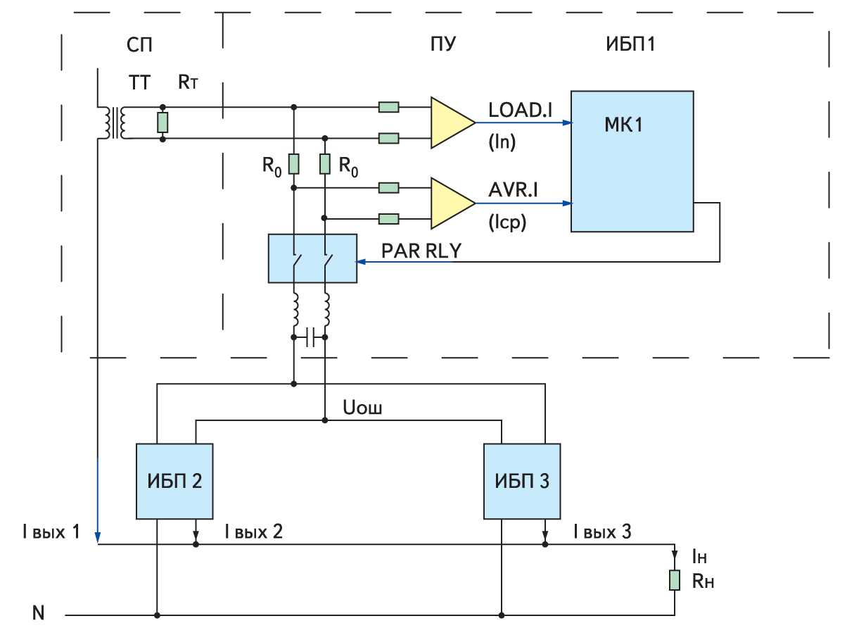 Напряжение Uош поступает на соответствующий вход АЦП МК1 через аналоговый модуль формирования сигнала AVR.I (Iср) на плате управления каждого ИБП (рис. 4). На другой вход АЦП МК1 приходит сигнал LOAD.I, пропорциональный выходному току данного ИБП (In). В результате сравнения In и Iср МК1 принимает решение об изменении частоты инвертора, что сдвигает фазу выходного напряжения и выравнивает ток ИБП (In) до значения Iср. Погрешность измерения и разброс параметров элементов цепей обработки и масштабирования сигналов In, Iср определяют возможную точность распределения нагрузки между ИБП при параллельной работе, которая достигает 4–6%. Рекомендуемое количество параллельно включаемых ИБП не должно превышать 4.