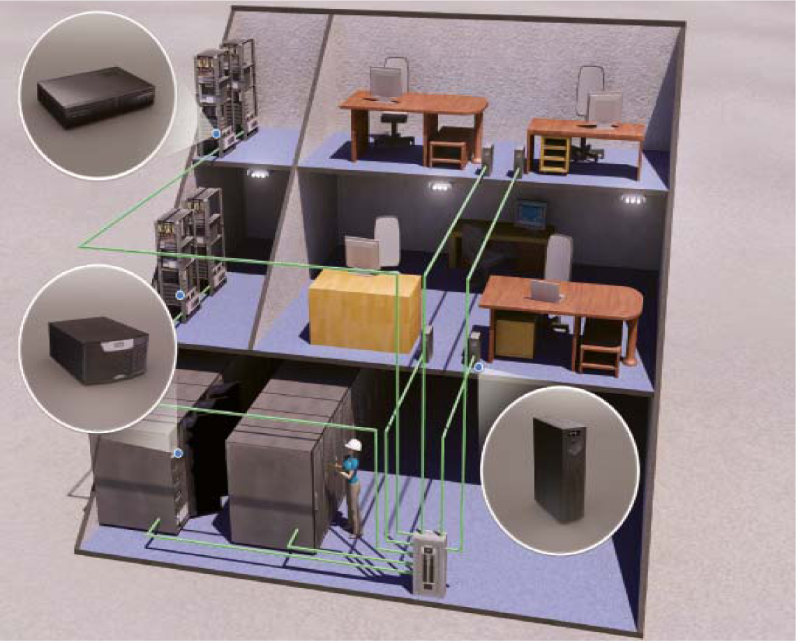Централизованный ИБП обычно располагается вне доступных и используемых мест. |