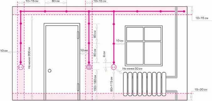 Делая разметку для электропроводки, нужно учитывать наличие обогревательных приборов, высоту потолка, расположение окон или дверей