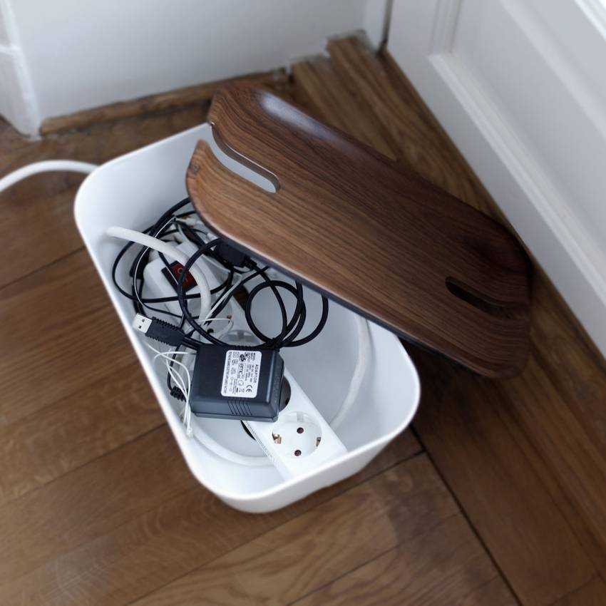 Спрятать провода можно в специальных декоративных коробках, которые подбираются под цвет пола или мебели