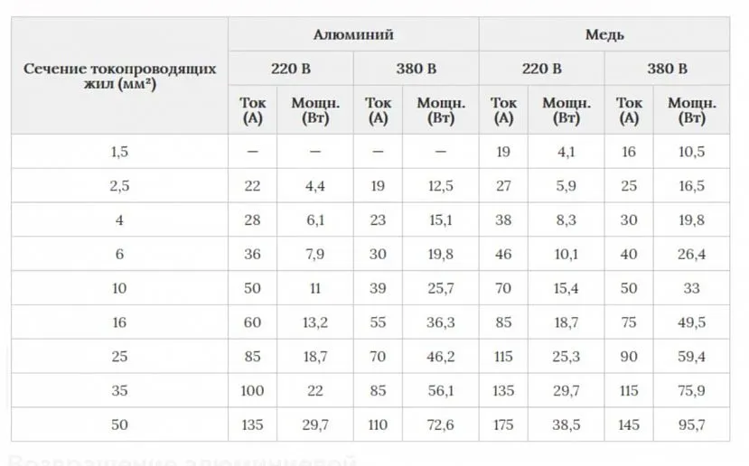 В качестве наглядного примера, можно рассмотреть сравнительную таблицу, построенную исходя из зависимости каждого проводника к мощности подключенных потребителей.