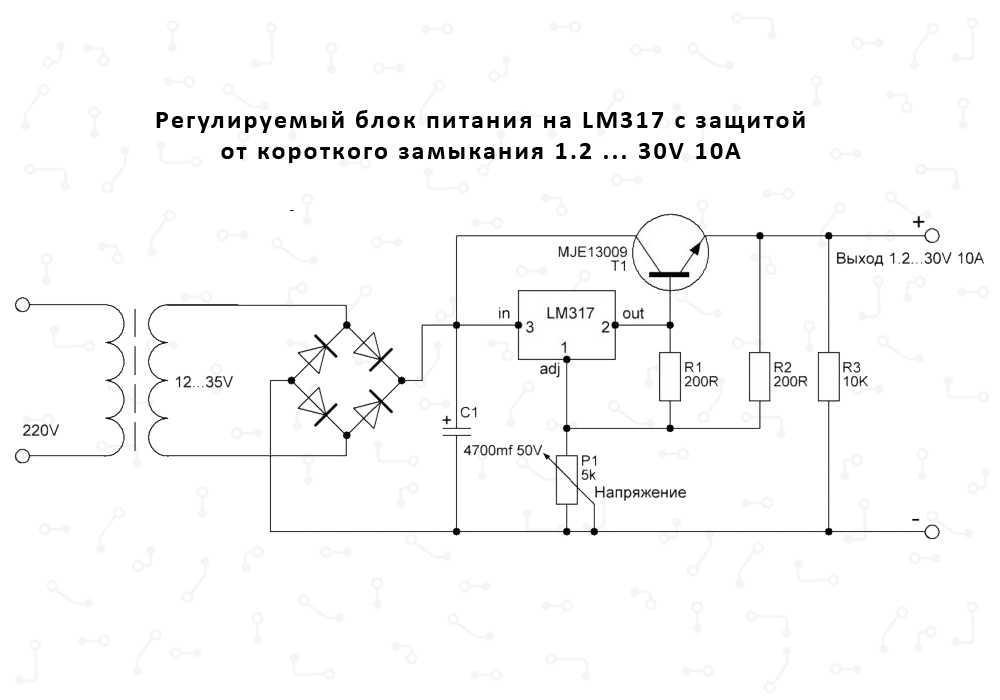Все, что понадобится для его создания, это заменить R2 на переменный резистор, а также добавить трансформатор с диодным мостом на вход. При использовании стоит учитывать, что микросхема обладает опорным напряжением в 1.25В, поэтому оно и будет минимальным для данной схемы.