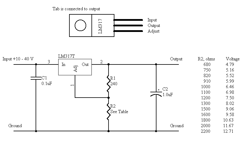Соберем простой стабилизатор напряжения используя LM317 согласно схеме.
