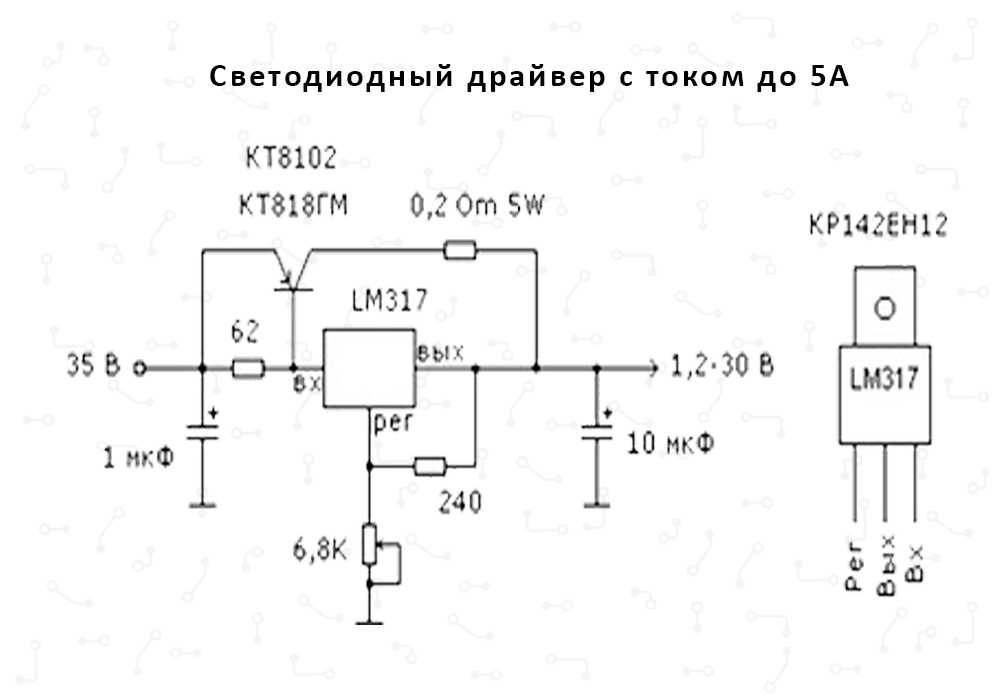 Как было указано, в LM317 используется при создании регулируемых и нерегулируемых блоков питания, однако, также может быть использован в качестве основы стабилизатора тока при создании светодиодных драйверов, которые поддерживают ток в цепи вне зависимости от входного напряжения. Только описанных в datasheet применений хватит на отдельную книгу, поэтому разберем несколько самых популярных схем на этом стабилизаторе.