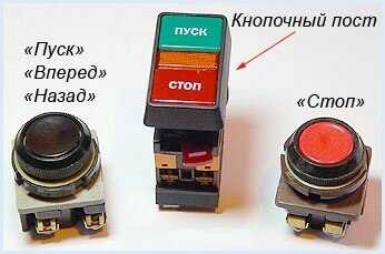 Данная универсализация всех кнопок кнопочного поста сделана для того, чтобы предвидеть возможные схемы обеспечения моментального реверса двигателя. Общепринято называть отключающую кнопку словом: «Стоп » и маркировать её красным цветом. Включающую кнопку часто называют пусковой, стартовой, или обозначают словом «Пуск », «Вперёд », «Назад ».