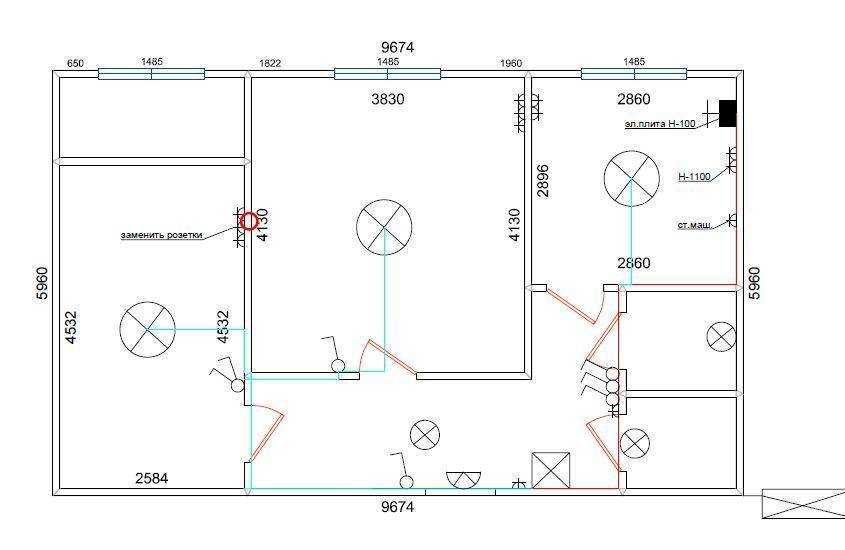 - Вертикальная электропроводка должна проходить на расстоянии ≥ 0,1 м от оконных и дверных проемов;