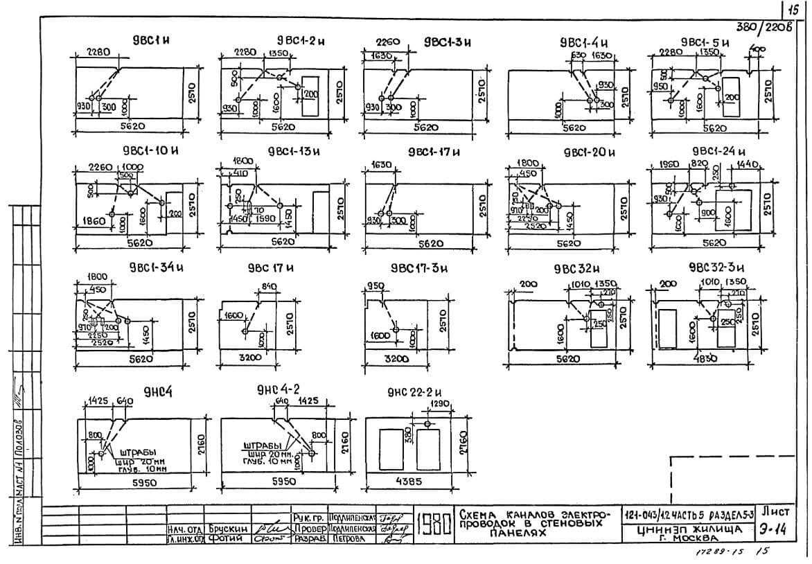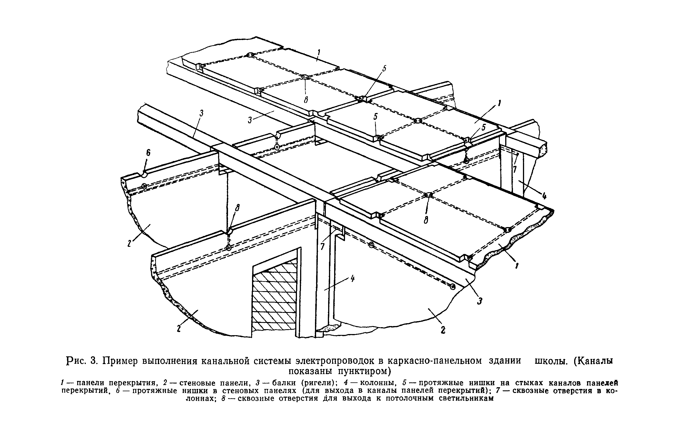 Проводка в панельных домах прокладывается в специальных каналах внутри панелей. Они предусмотрены конструкцией плит. На рисунке ниже вы видите несколько примеров типовых расположений каналов.