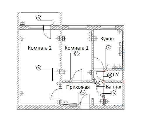Замена электропроводки в хрущевке требует хотя бы приблизительного знания где она может быть (где проходит кабель), а также знания типовых схем. Электрическая схема квартиры зависит от количества комнат. Обобщённо выходит следующая ситуация: в каждой жилой комнате есть 1 светильник и 2-4 розетки (в зависимости от площади), при этом в маленьких комнатах, порядка 10 кв. м. может быть и вовсе 1 розетка.