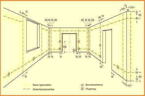 После формирования групп, определяются места, где будут подключаться основные потребители электроэнергии. К ним относятся электроплиты, стиральные машины, водонагреватели, кондиционеры, посудомоечные машины и духовки. Места установки розеток, выключателей, осветительных приборов и распределительных коробок отмечаются на предварительной схеме электрооборудования квартиры. Далее выполняется условное соединение проводов, а их длина на каждом участке также отмечается на схеме.