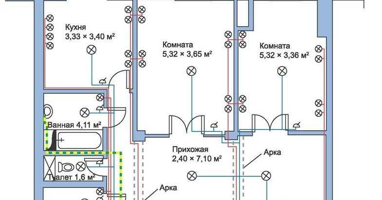 - Отдельно подключаются освещение и питание к помещениям с повышенной влажностью – ванной и санузлу. Данная группа должна быть выделена, поскольку к ней предъявляются повышенные требования.