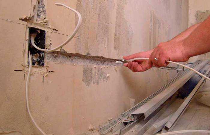 Снимите старые выключатели и розетки, вскройте распределительные коробки и рассоедините места коммутирования проводов. Иногда в панельных домах можно через распределительную коробку вытянуть весь провод из старой борозды. Но чаще всего просто начинают от коробки аккуратно выдёргивать проводник, если в каком-то месте он прочно прихвачен в штробе алебастровым раствором, то с помощью зубила и молотка освобождают его. В принципе, если некоторые старые штробы вы не будете использовать, то не морочьте голову, оставьте бывший провод там, только тщательно заизолируйте его с двух сторон.
