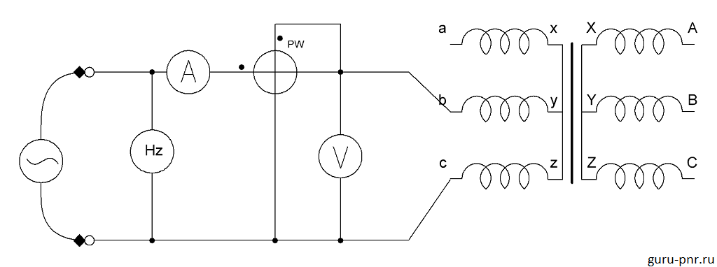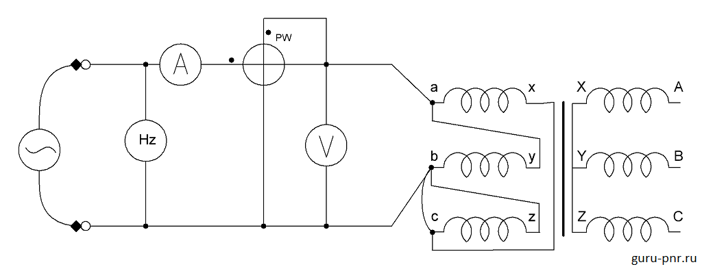 Приборы, указанные на рисунках нужно подключать именно в такой последовательности. Перед проведением испытаний нужно включить измерительную схему вхолостую (то есть не подключать к обмоткам трансформатора), чтобы определить потери в приборах (PПОТ). Фактическое измеренное значение мощности будет равно: