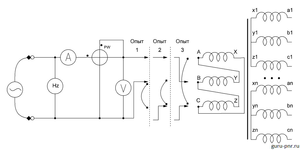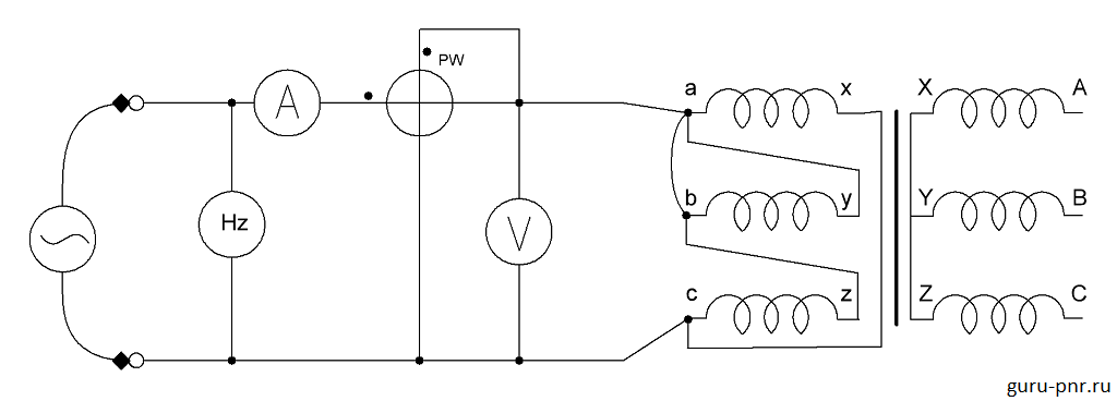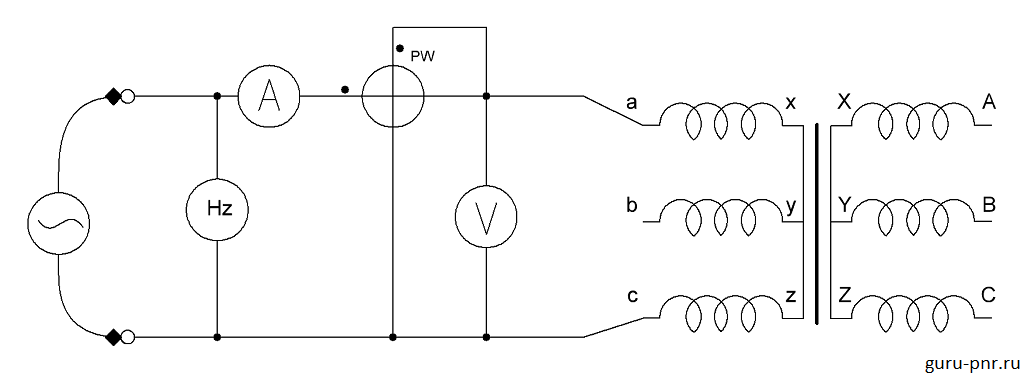 Номинальное напряжение подводится к соответствующей обмотке трансформатора. При разомкнутых вторичных обмотках, производится замер токов и мощностей, потребляемых трансформатором от сети.