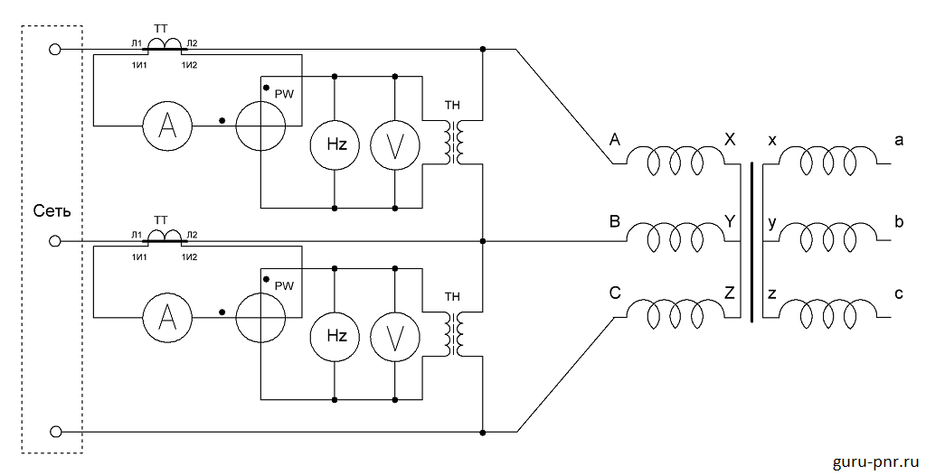 Сумма показаний ваттметров дает значение потерь в трансформаторе, которые вызывают нагрев обмоток. Мощность, показываемая ваттметром,