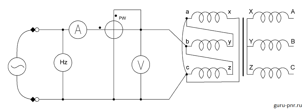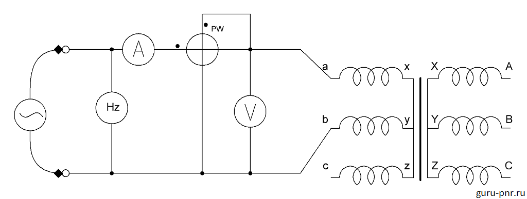 Измерение потерь холостого хода трехфазного трансформатора от питающей сети: