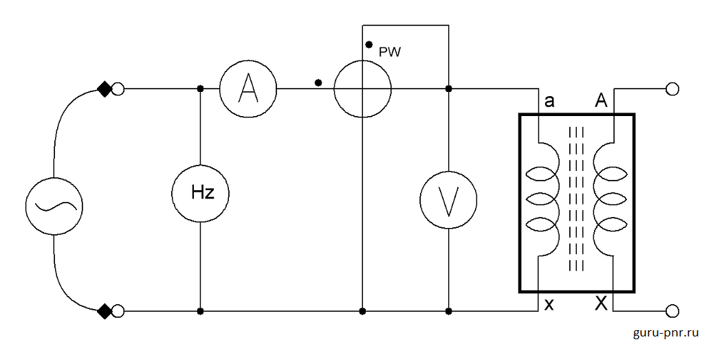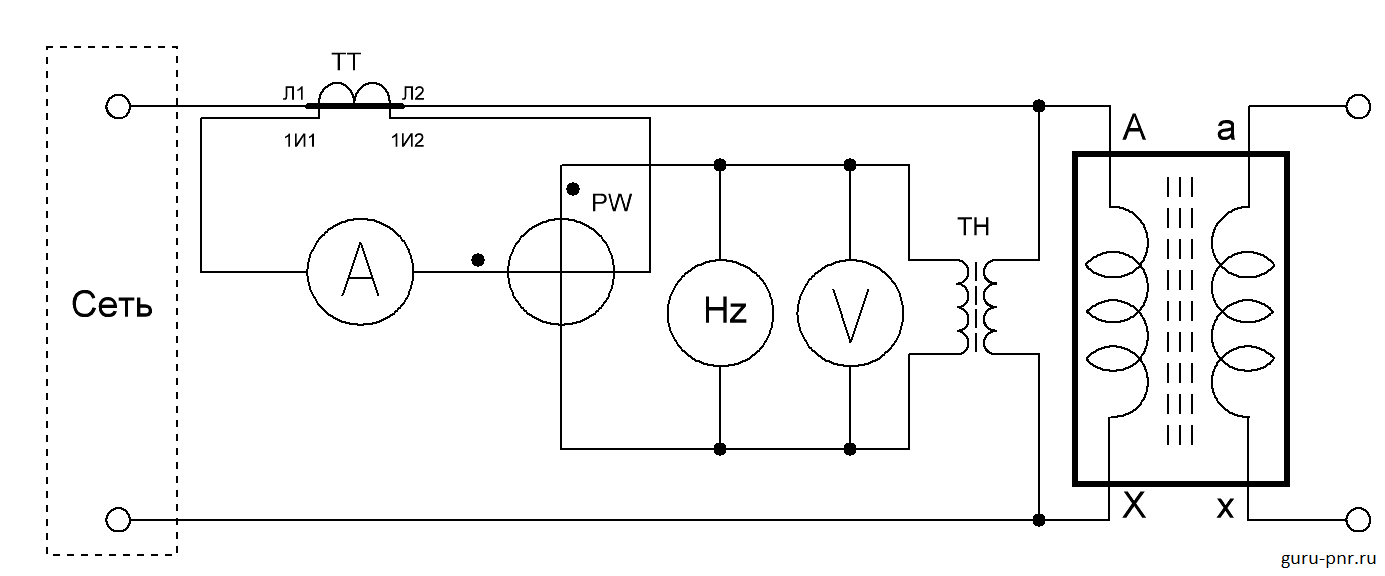 Измерение потерь холостого хода однофазного трансформатора от питающей сети производится по схеме, приведенной на рисунке ниже: