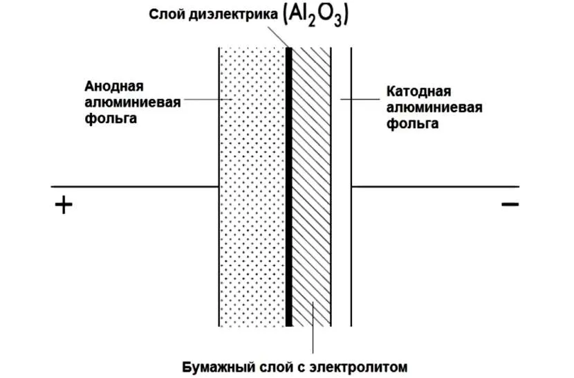 Между обкладками находится слой диэлектрика — материала плохо проводящего электрический ток