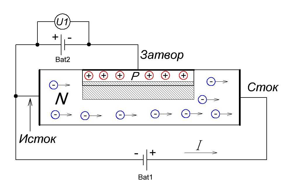 Так вот, третий вывод полевого транзистора, который соединяется с P полупроводником называется тоже ЗАТВОРОМ и служит как раз для того, чтобы регулировать силу тока в бруске, через который бежит электрический ток