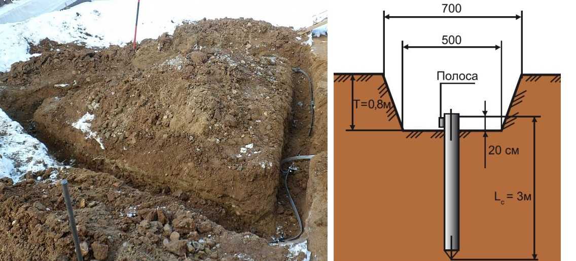 Обратите внимание, заземлитель на выводят на поверхность земли. Он находится ниже уровня грунта на 50-60 см