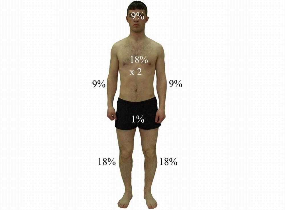 Для того, чтобы определить площадь поражённых тканей при ожогах, используют «правило девяток». Его суть заключается в том, что участок кожи на каждой отдельной части тела, имеет своё процентное соотношение к общей площади тканей всего тела: