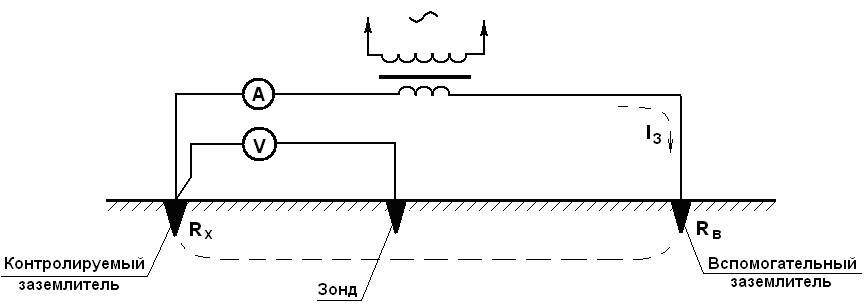 Чтобы измерить сопротивление методом амперметра-вольтметра необходимо воспользоваться законом Ома. Итак, по формуле R=U/I находим сопротивление контура заземления. Такой метод хорошо подходит для измерений в частном доме. Чтобы получить нужный измерительный ток можно воспользоваться сварочным трансформатором. Также подойдут и другие виды трансформаторов, вторичная обмотка которых электрически не связана с первичной.
