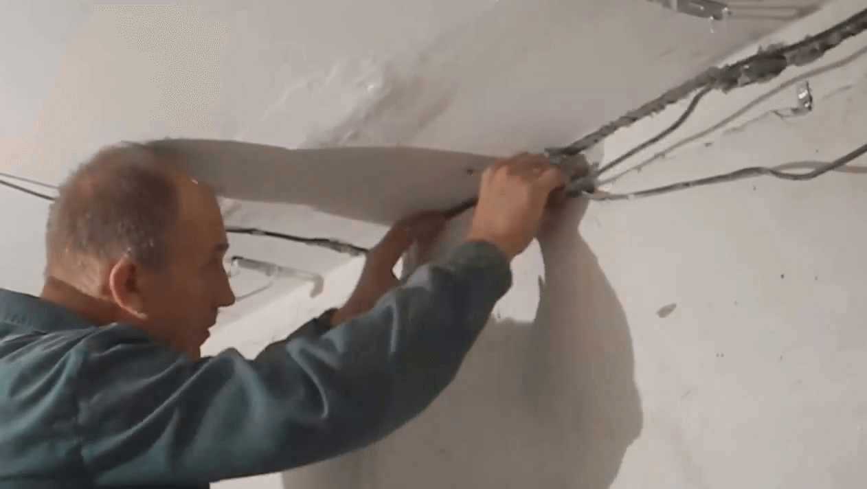 Надо иметь в виду, что из-за создания каналов конструкция ослабляется. Поэтому, дабы не навредить арматуре, которая поддерживает потолок и стены, провода нельзя располагать на глубине более 1 см. Чтобы предотвратить выпадение проводки из канавки, применяют алебастр или дюбель-хомуты, требующие проделывать небольшие дырочки.