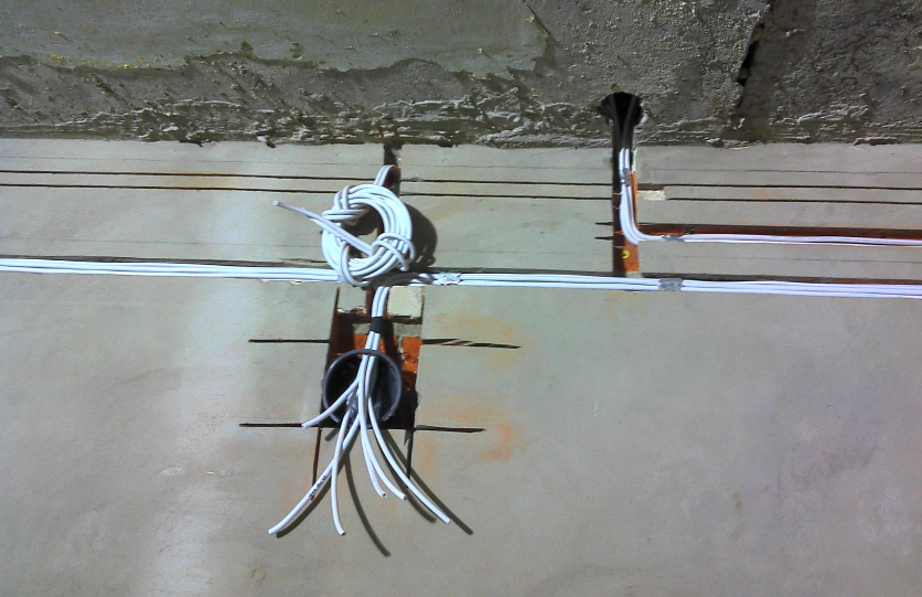 - Во избежание механических повреждений, рекомендовано прокладывать кабель на расстоянии 20-25 см от потолка. Еще одним вариантом является прокладывание провода по полу, его закладывают в плинтус, такой способ удобный при демонтаже или ремонте.