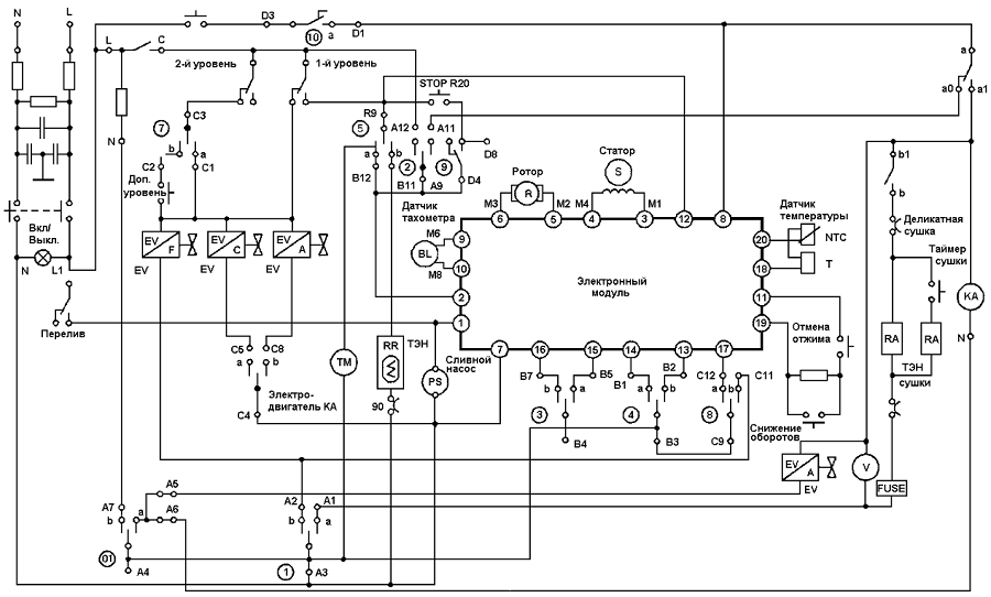Принципиальная электрическая схема стиральной машины Аристон показывает точную связь между всеми элементами, входящими в данную схему. Не все знают, что представляет собой принципиальная схема и чем она отличается от печатной платы. На самом деле, это графическое отображение на бумажном носителе, необходимое для передачи связи между ключевыми элементами, с использованием условно-графических, буквенно-цифровых символов. На принципиальной схеме не отображается взаимное размещение элементов. Здесь указываются выводы настоящих элементов и пути их соединения с другими элементами.