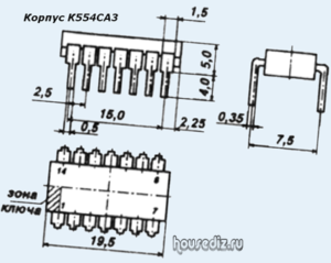 В качестве компаратора выбрана микросхема К554СА3 —элемент DD1. Размеры ее корпуса в миллиметрах представлены нижерасположенной картинкой.