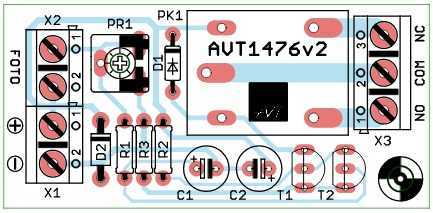 Как следствие, транзистор T2 закрывается, а транзистор T1 открывается, и реле RL1 замыкает контакты. Падение напряжения на резисторе R3 определяет гистерезис переключателя. Конденсатор С1 защищает систему от кратковременных изменений освещения, вызванных, например, фарами проезжающих автомобилей. Сопротивление фоторезистора при дневном освещении составляет несколько сотен Ом, а после наступления темноты оно увеличивается до нескольких десятков килоом. Во время калибровки переключателя может потребоваться отпаять конденсатор C1, чтобы время реакции системы было меньше. Используя потенциометр PR1, мы настраиваем черту активации порога переключения. Допустимая контактная нагрузка реле, используемого в модели, составляет 10А. Схема сборки автоматического сумеречного выключателя показана на рисунке 2.